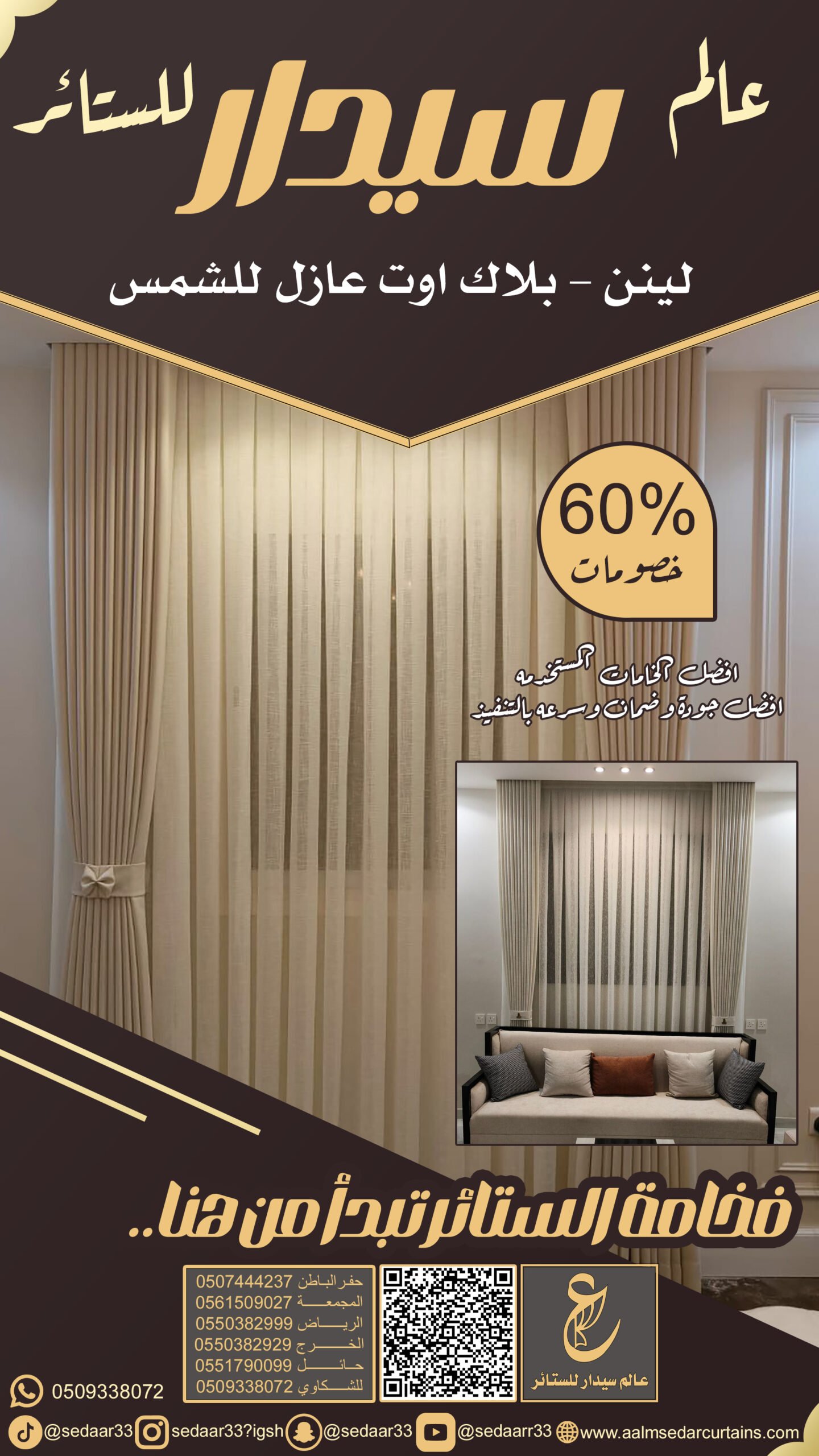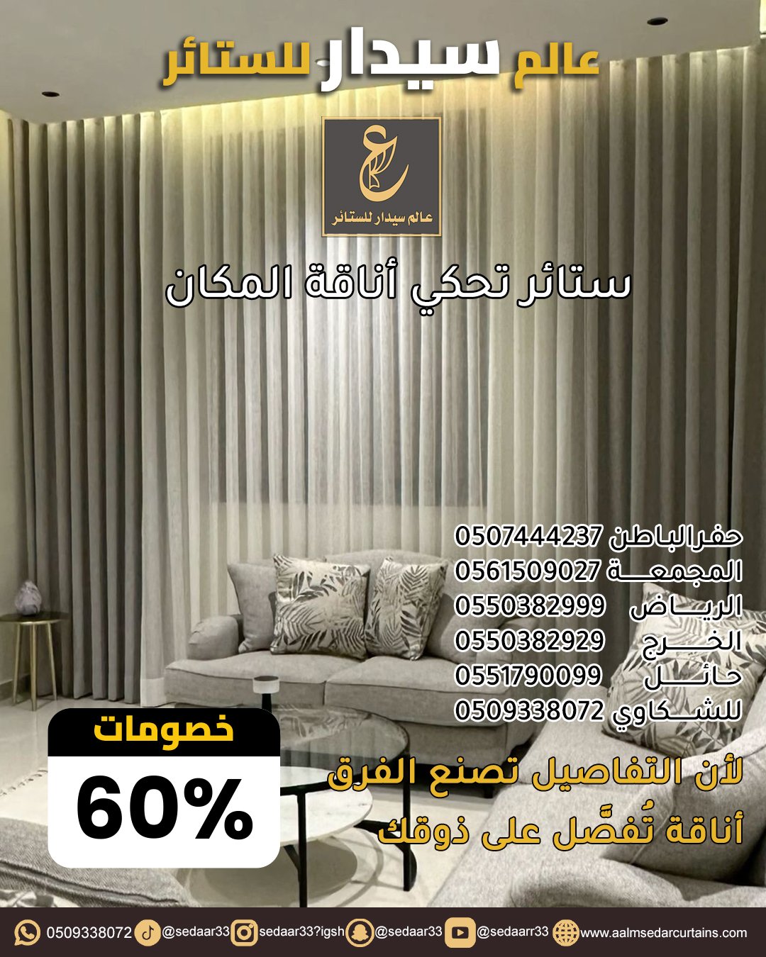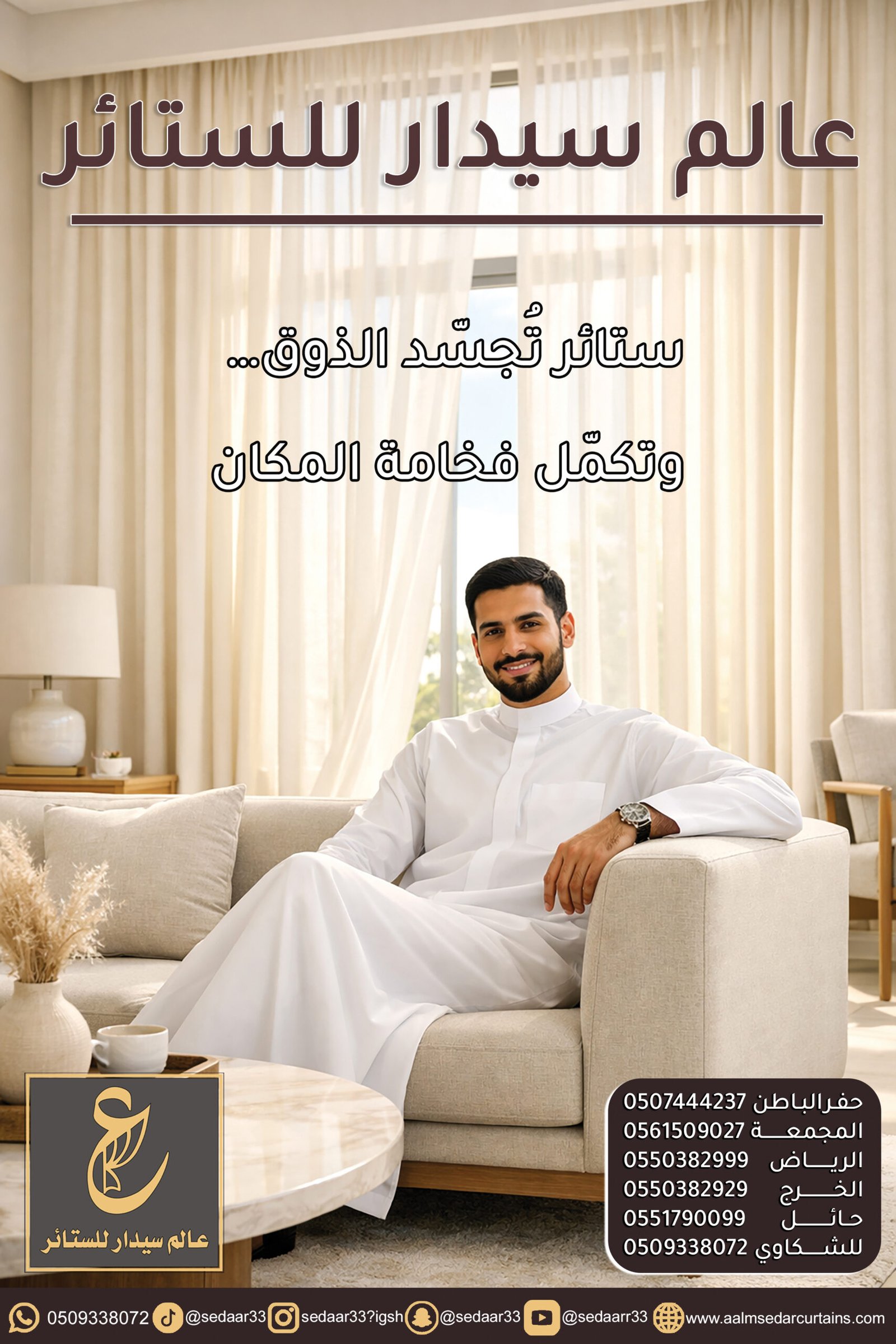في عالم سيدرا، نؤمن أن الستائر هي الروح التي تمنح الغرفة هويتها الخاصة. هي الأداة السحرية التي تتحكم في الضوء، وتصنع الخصوصية، وتكمل لوحة الديكور. نحن لا نختار الأقمشة عشوائياً، بل ندرس زوايا الإضاءة ونوع الأثاث لنقدم لك حلاً بصرياً يحول منزلك إلى تحفة فنية.