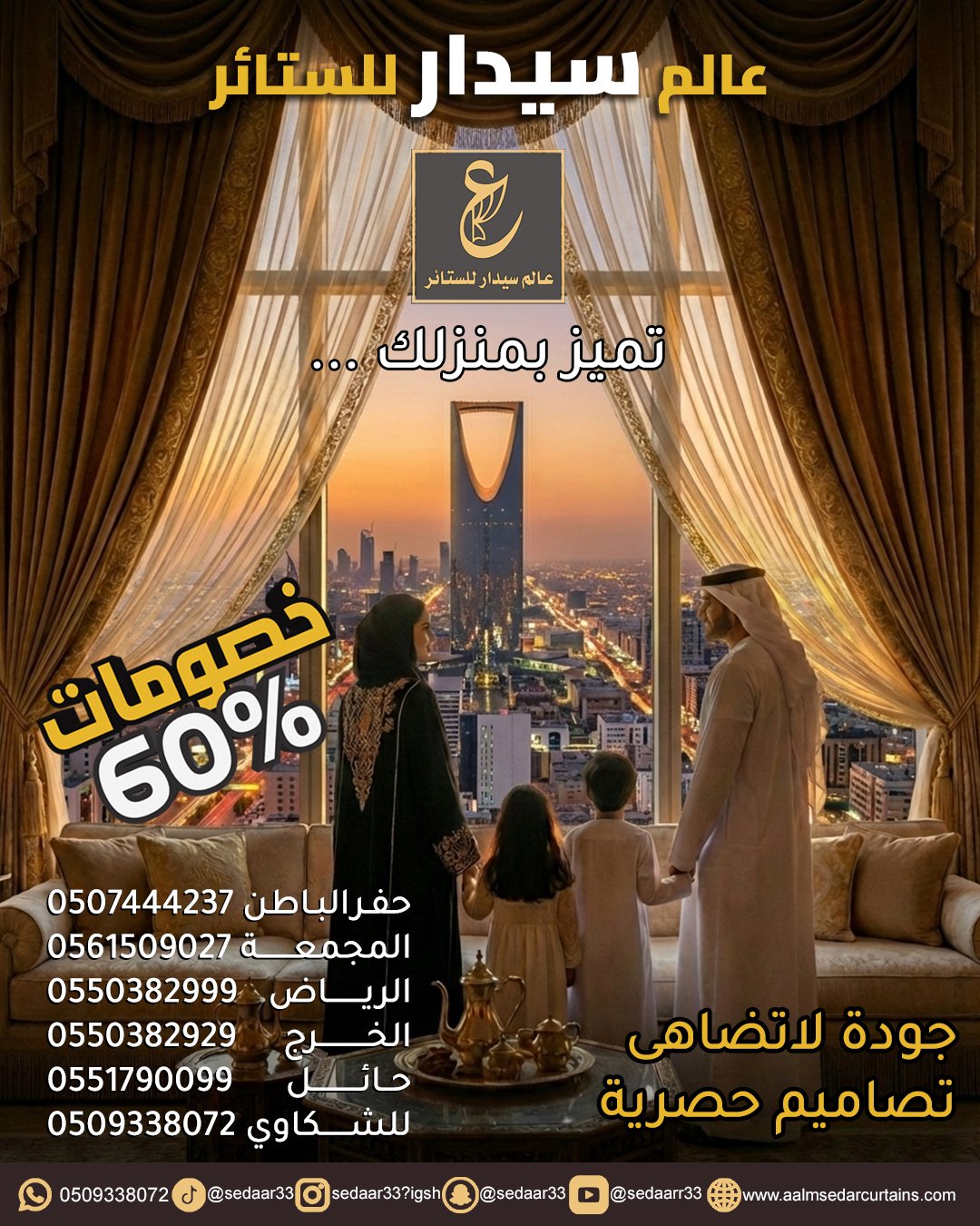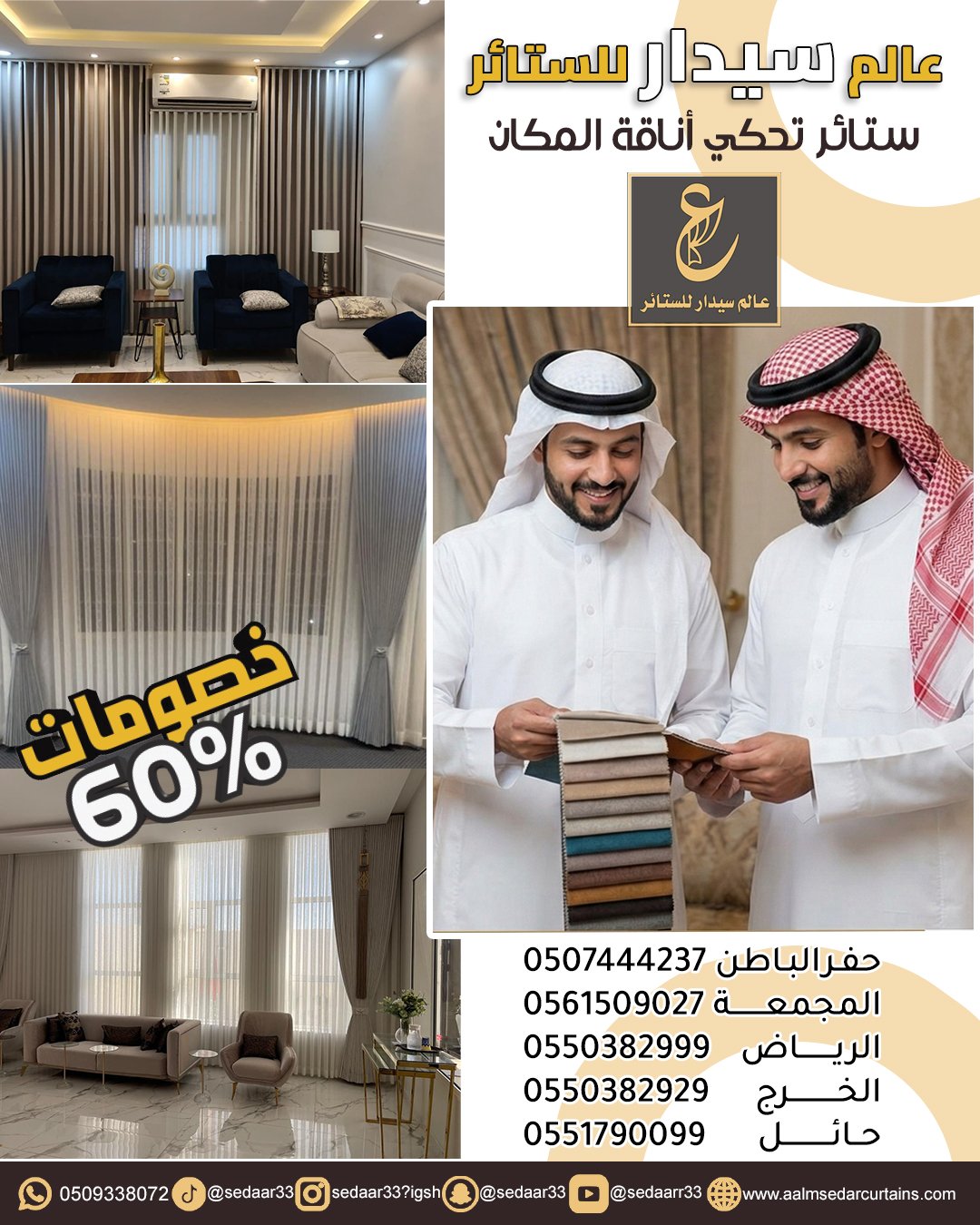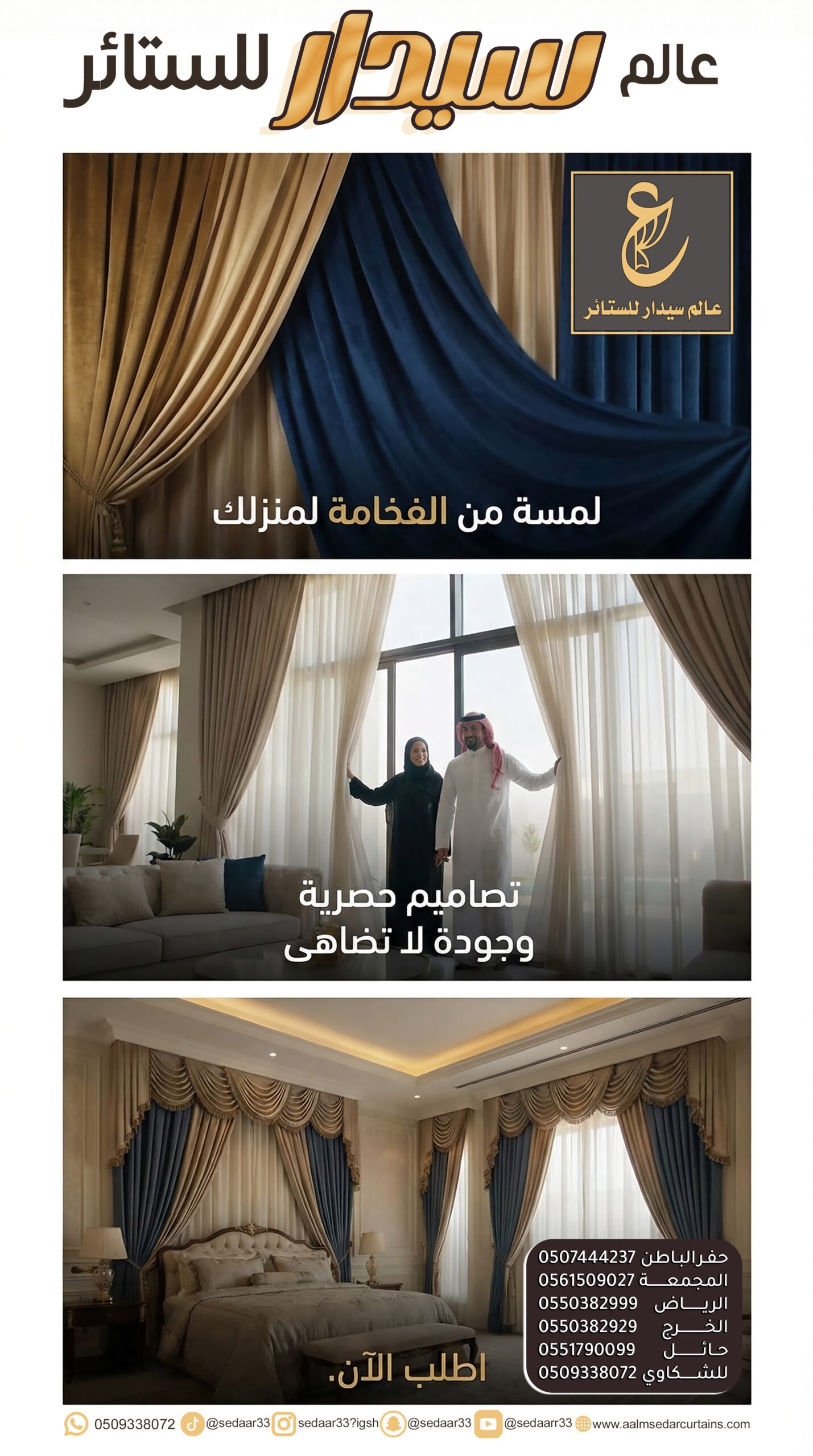 في عالم سيدرا، نؤمن أن الستائر هي الروح التي تمنح الغرفة هويتها الخاصة. هي الأداة السحرية التي تتحكم في الضوء، وتصنع الخصوصية، وتكمل لوحة الديكور. نحن لا نختار الأقمشة عشوائياً، بل ندرس زوايا الإضاءة ونوع الأثاث لنقدم لك حلاً بصرياً يحول منزلك إلى تحفة فنية.