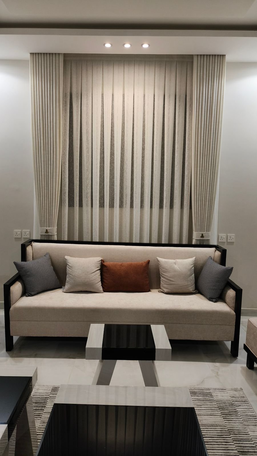 مثالية جداً مع الكنبات المودرن (مثل الكنبة البيضاء البسيطة) لأنها تكسر حدة الزوايا بنعومتها.